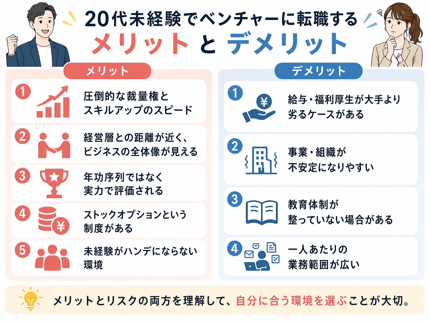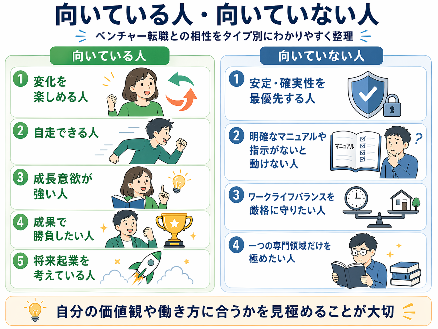 メリットとデメリットを踏まえて、ベンチャー転職との相性を整理します。自分がどちらに近いかを正直に見極めることが、転職後の満足度を左右します。